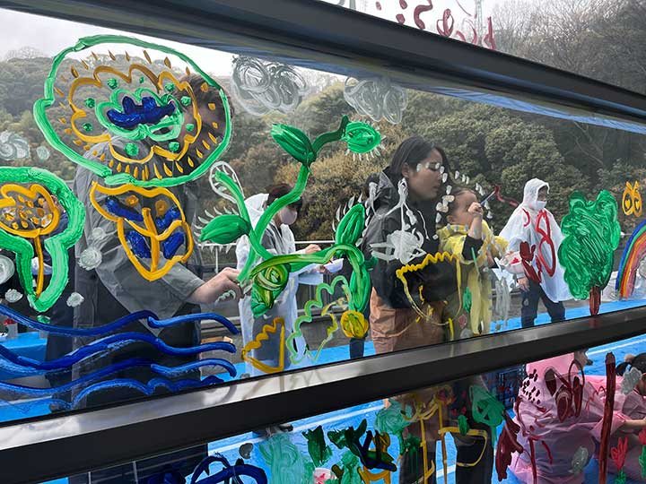 ミュージアムの大きなガラス面に絵を描きます。遠山敦さん(イラストレーター・アーティスト)と一緒に、自由に描きつつ、相談したり協力したりしながら、みんなで大きな絵にしていきましょう。完成した作品は、4月下旬頃まで展示予定です。