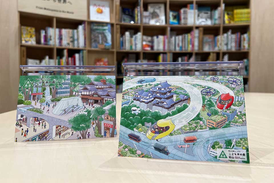 「こども本の森 松山」オープン前のプレイベント「未来の松山を描こう!香川元太郎さんといっしょに」で、その見本として元太郎さんが描いたラフ画を、娘の志織さんがイラスト化したポストカード。